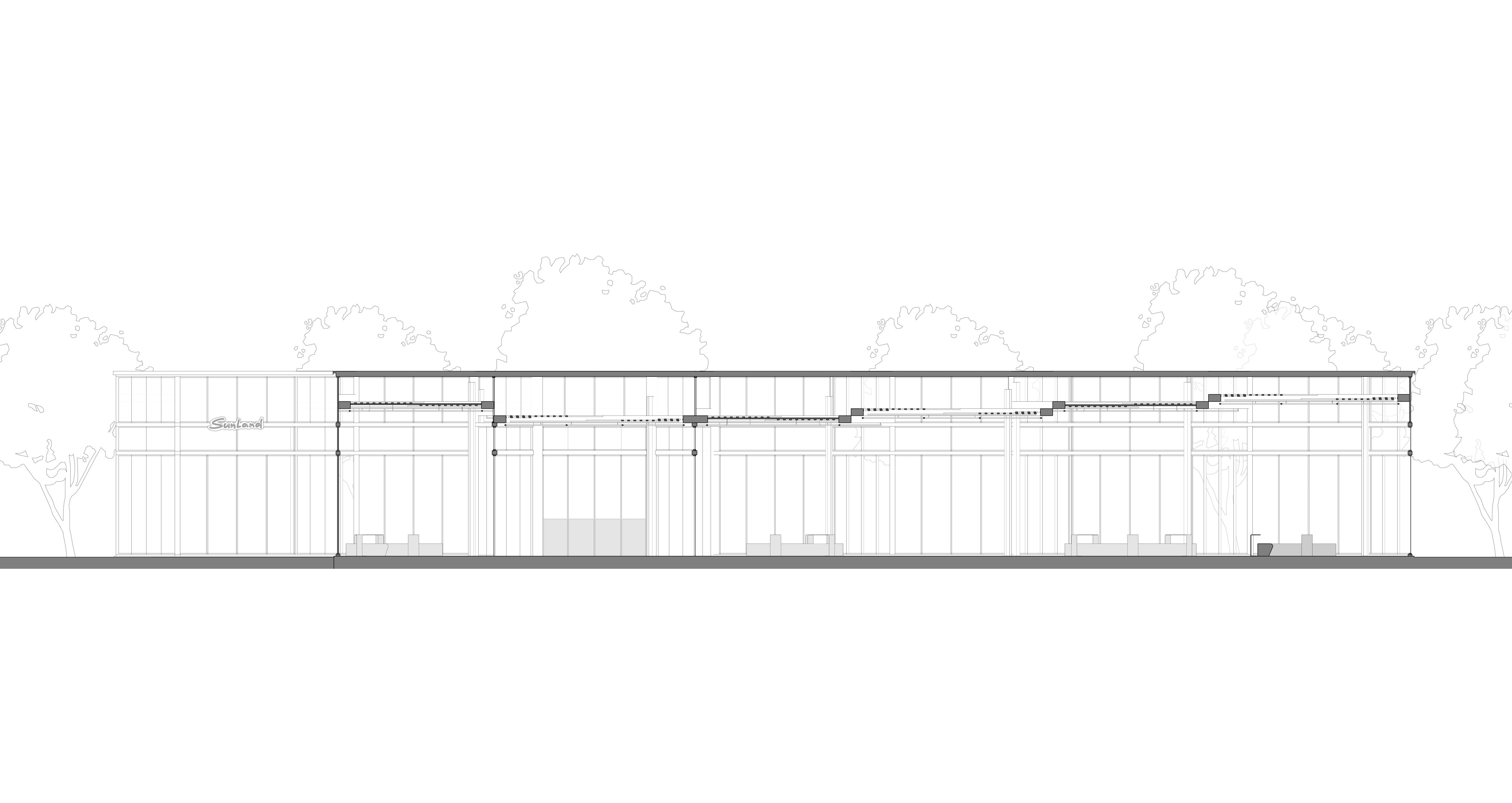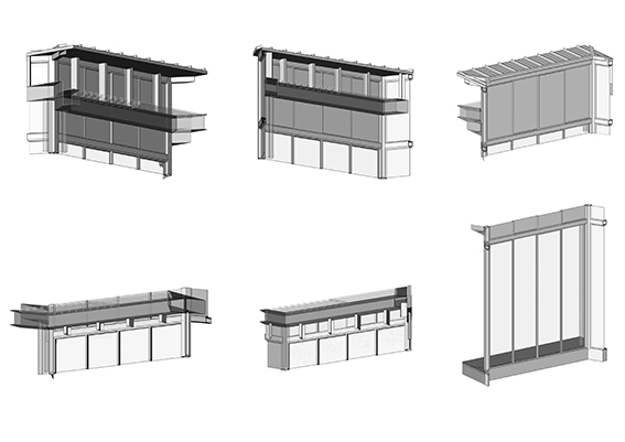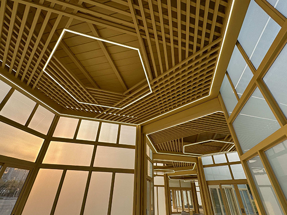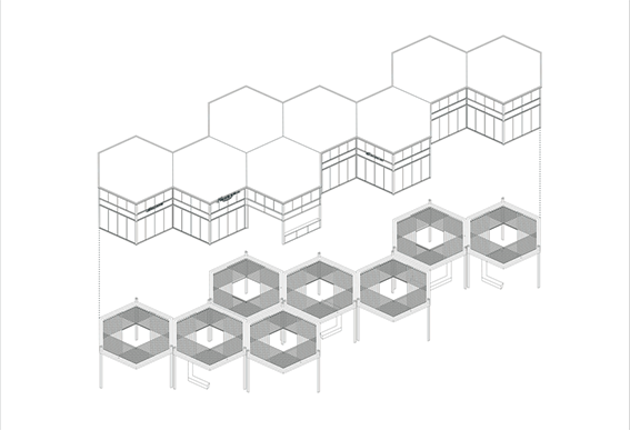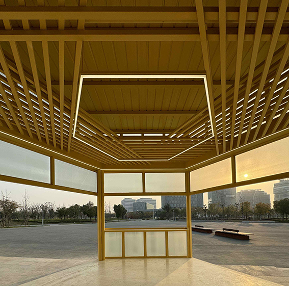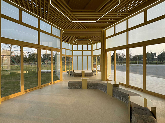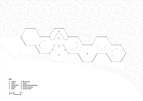 当业主表达也可以拆除原构筑物来新建驿站时,我们的选择是保留改造这种进化模式。这至少可以让这公园里原有的六角亭不会变成一堆建筑垃圾。保留的钢结构的承载力利用可以减小新增结构的构件尺寸,新建筑构件包裹原构筑物并隐藏其高度变化,统一高度的外壳简化屋面排水和保温隔热的实现难度,原亭子屋顶细部结构造型成为新建建筑的室内吊顶装饰物。新驿站功能依据现存六角亭平面改造布局,利用一个靠近运动场地的六角亭空间形成整个建筑的玄关,前台和后勤空间紧邻玄关空间并便于服务带形建筑的两端,原亭子下的石条凳利用成为驿站内部和庭院座椅,原有建筑周围的园林排水沟灵活保留利用。旧物尽其用,创造新空间。