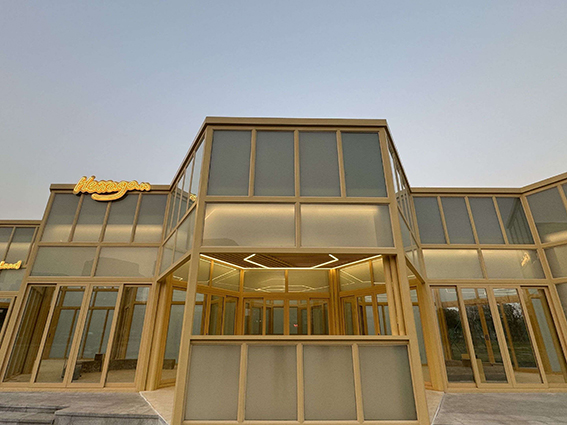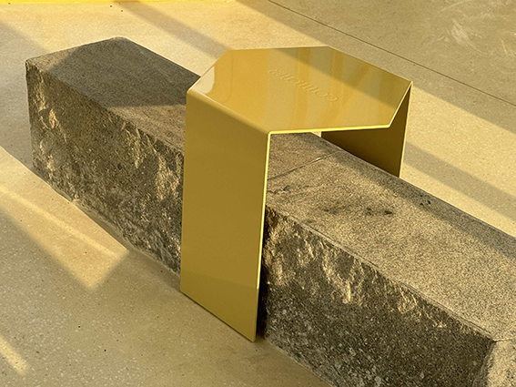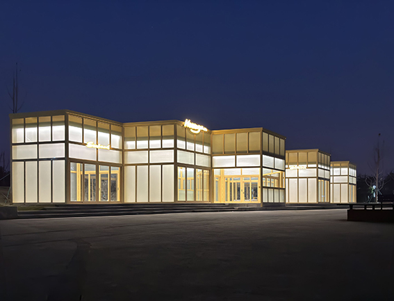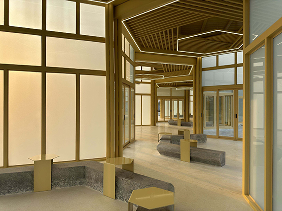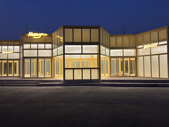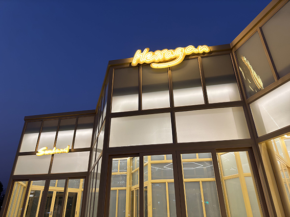 在解决基本功能需求前提下创造建筑的个性化使用体验。在保留的石条凳上添加纯铝定制的COMMON CASA六边形咖啡桌,使每个条凳实现三组桌椅使用组合,材料保证百分百可回收利用。每个六角空间内定制两圈六角形LED灯条,以便捷固定形式结合原有结构并强化的建筑空间特点。大量采用的白色夹胶玻璃成为反射载体并实现六角灯带在室内的连绵反射视觉游戏。入口标志物以建筑物平面图为原型树立六角驿站的独特文化标志。