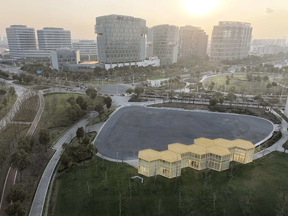 六角驿站作为“水上森兰”的水陆结合运动休闲系统的组成元素,以通用型建筑功能安排,便于满足未来作为自行车、陆冲、轮滑等可与水上休闲运动项目共享人群与消费体验的公共服务驿站运营需求。建筑立面的推拉开启扇和固定扇的1:1穿插排布,满足未来建筑整体运营或分段独立经营的灵活变化需求。依托六边形建筑轮廓所形成的外形进退变化,实现朝向多个方向的室外独立庭院空间。入口玄关的咖啡站台功能,将是家长观赏子女运动玩耍的舒适休憩场所。