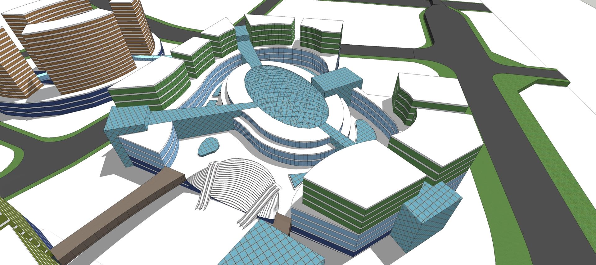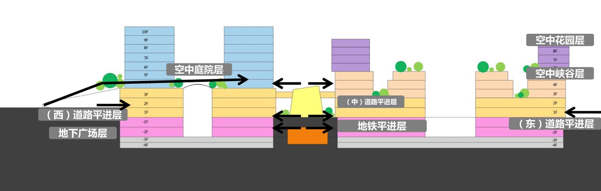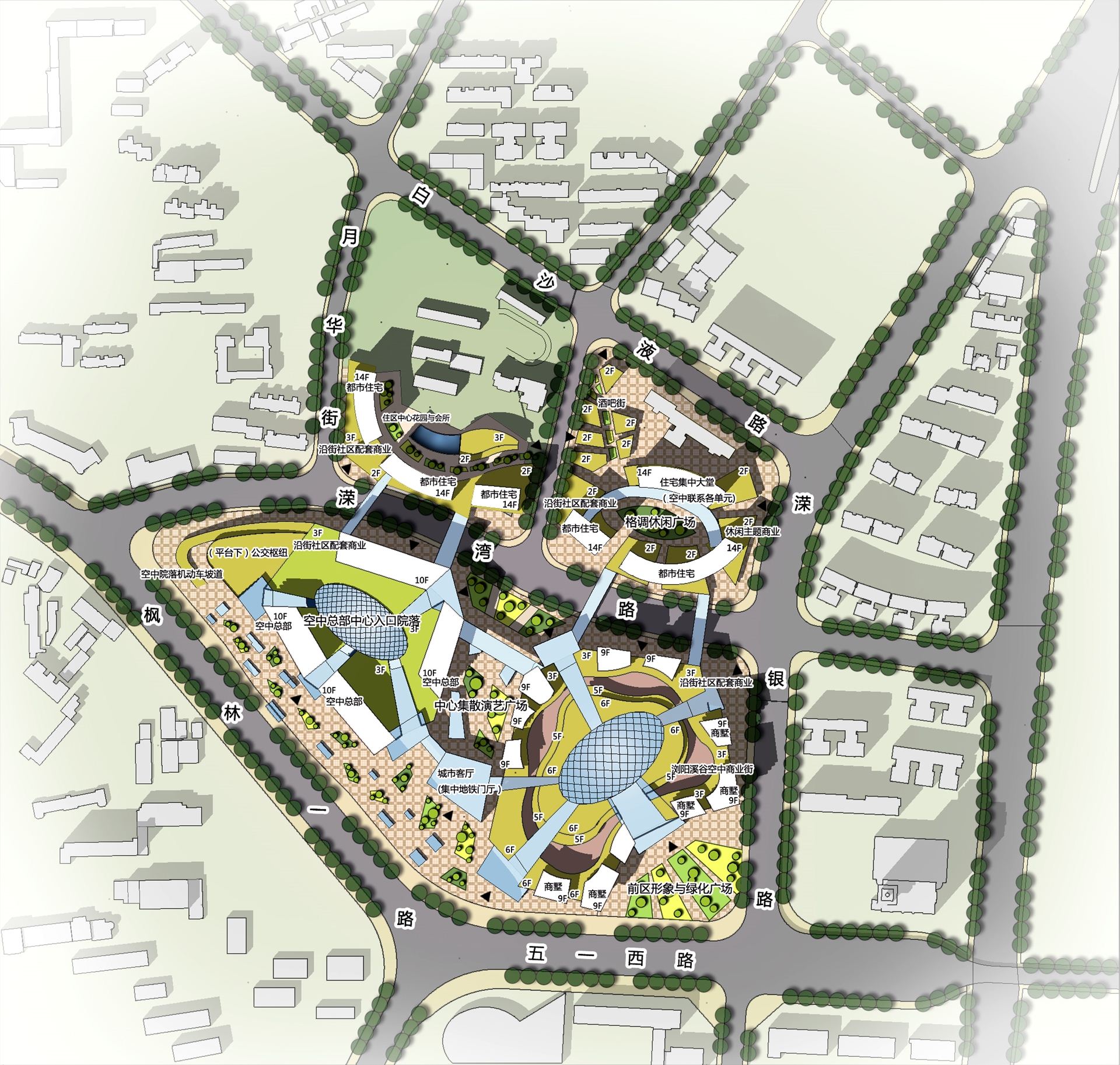 本案位于长沙市岳麓区荣湾镇,是长沙大河西先导区的一部分,位于岳麓山脚下,有两条地铁线穿过,区位极佳。利用用地存在的高差,将机动车引入裙房之上,商业和办公实现了多平台出入口,实现了商业的超高人气和办公的独立门厅。空中总部,主题风情天街以及空中商墅都各具特色。