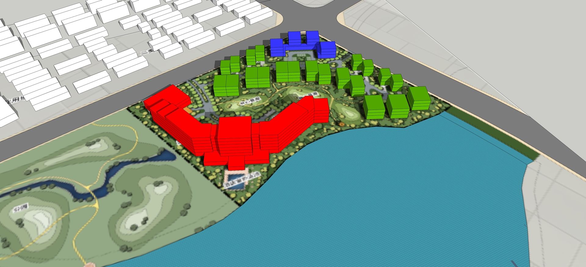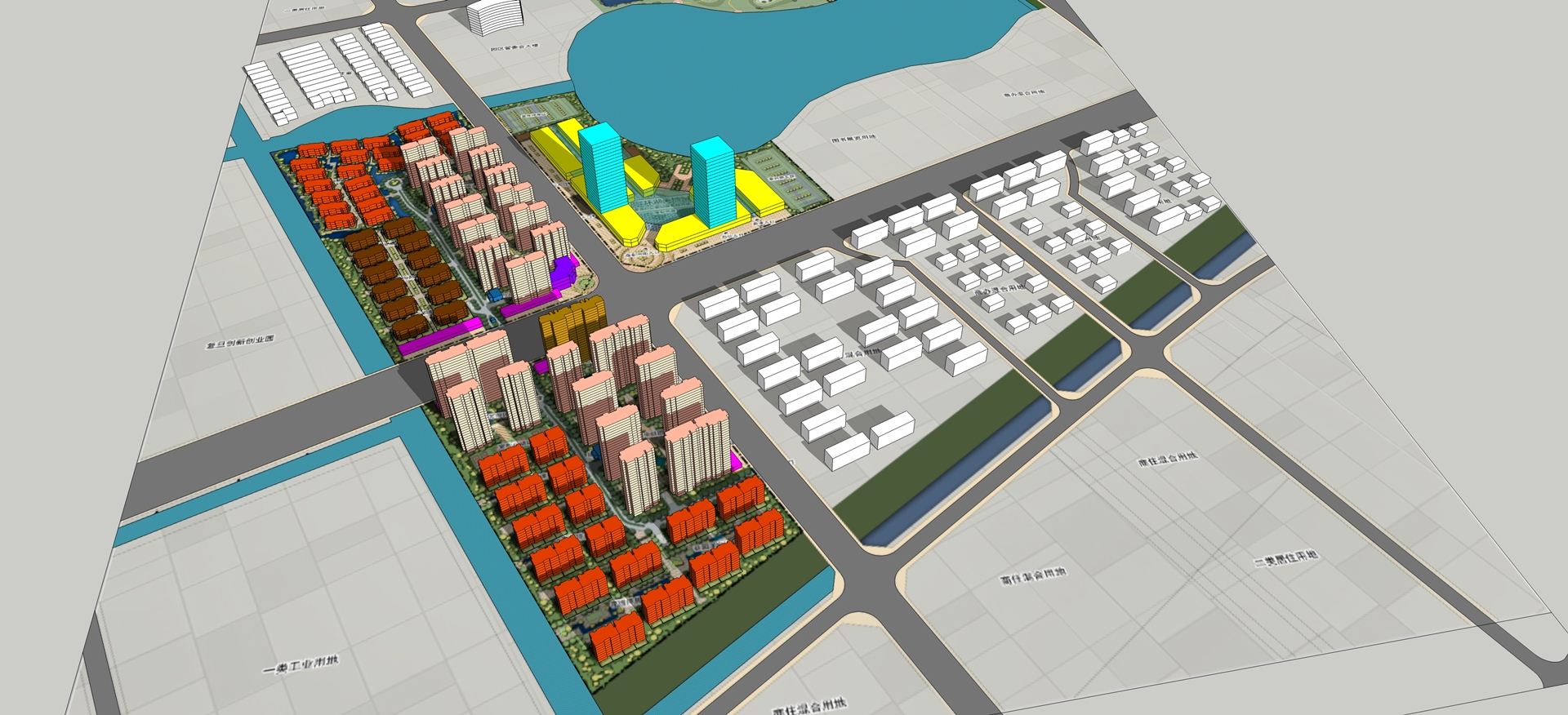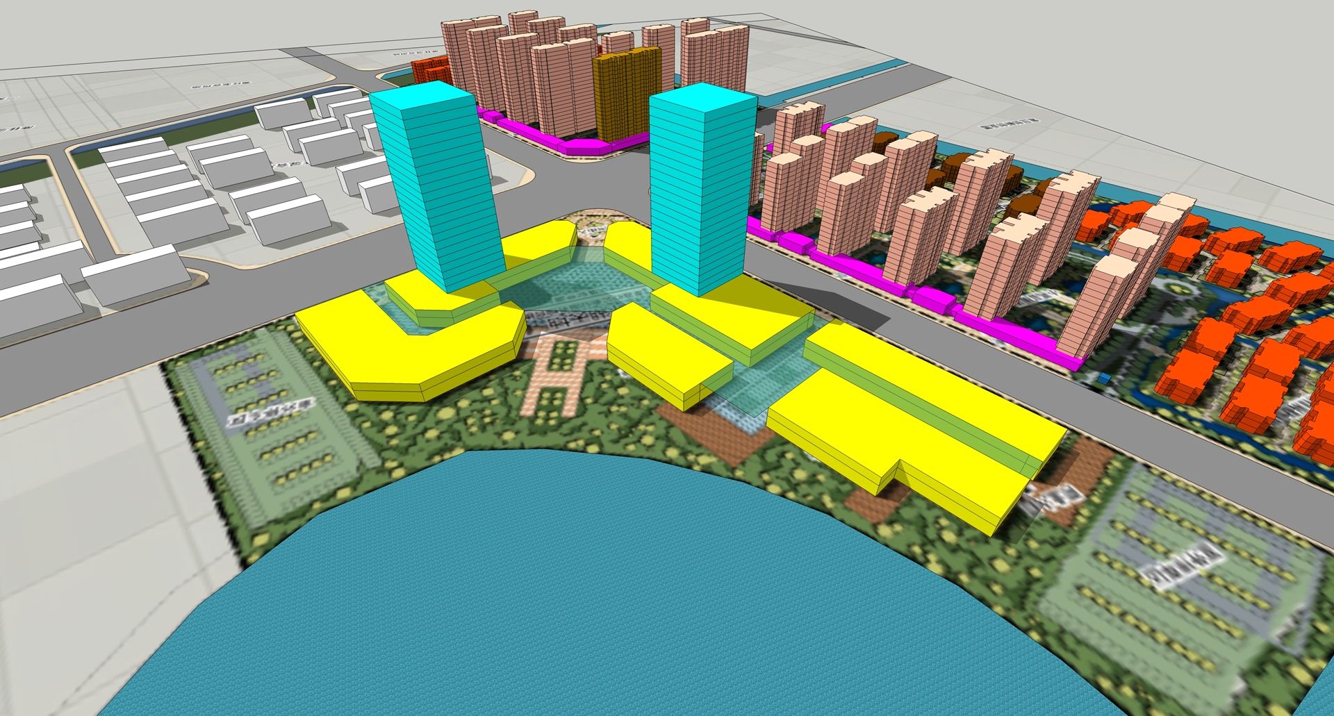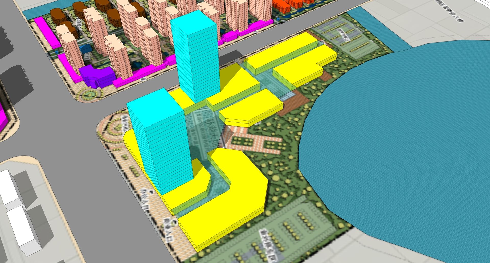 本项目的设计目标为打造一座舒适、悠闲、宜人的复合型滨水新城。滨水环境提供了一个清新自然的平台,营造一种悠然自得的生活方式,舒适的商业及办公布局,加上园林式五星级酒店的高贵与雅致,一同营造出一个和谐而有节奏的生活场景,从而打造出一座具有吸引力的滨水新城。