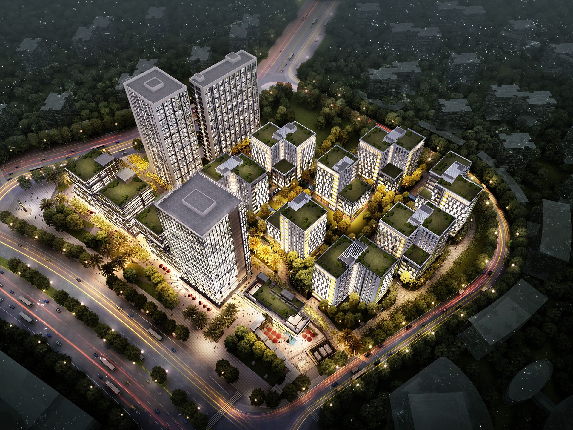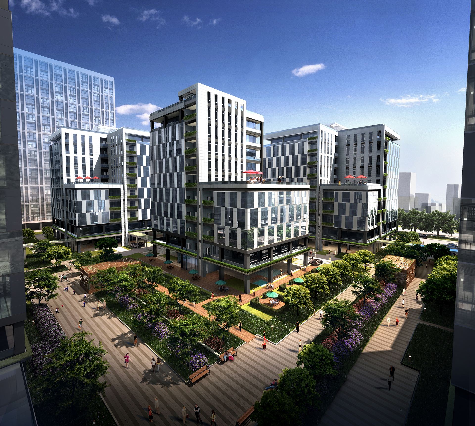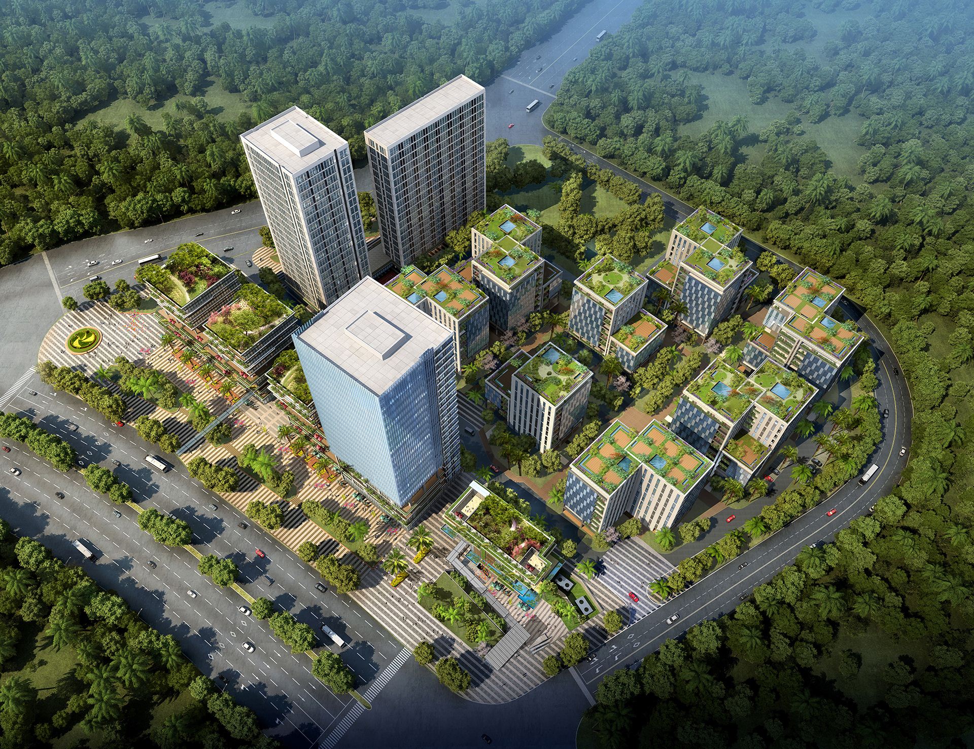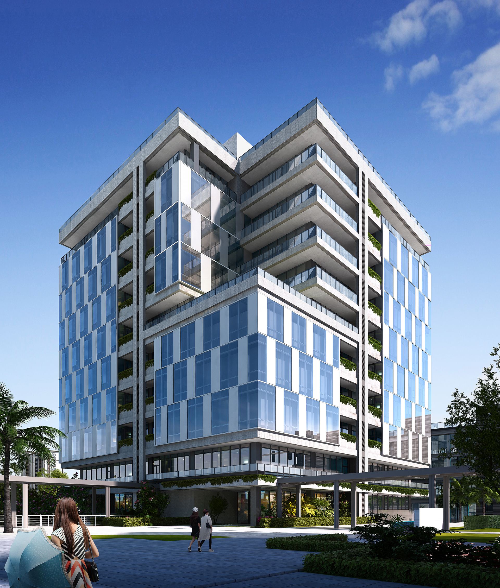 花园办公:基地沿街设置大平层办公平台模式并提出立体式露台花园办公的产品理念,具有灵活划分特点的办公空间组合,适应不同规模的企业需求;空间具有灵活性,适应各类使用要求。每栋企业总部由底层私家花园、入户花园电梯厅、总裁花园、露台花园构成的立体、多层次的绿化景观,实现