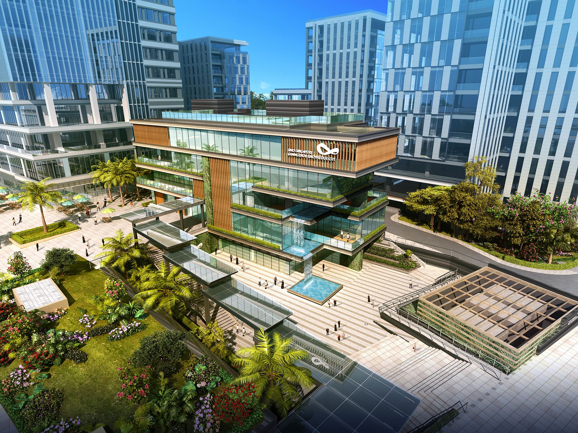 【山水之上】:“复合可变”“绿色生态”“智慧共享”充分发挥绿地优势,引入绿色建筑、智慧办公、花园办公等创新技术,打造可持续发展的花园社区